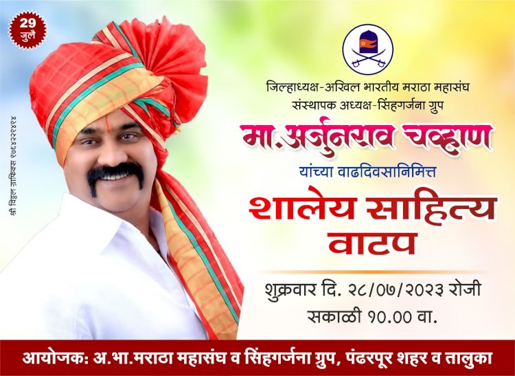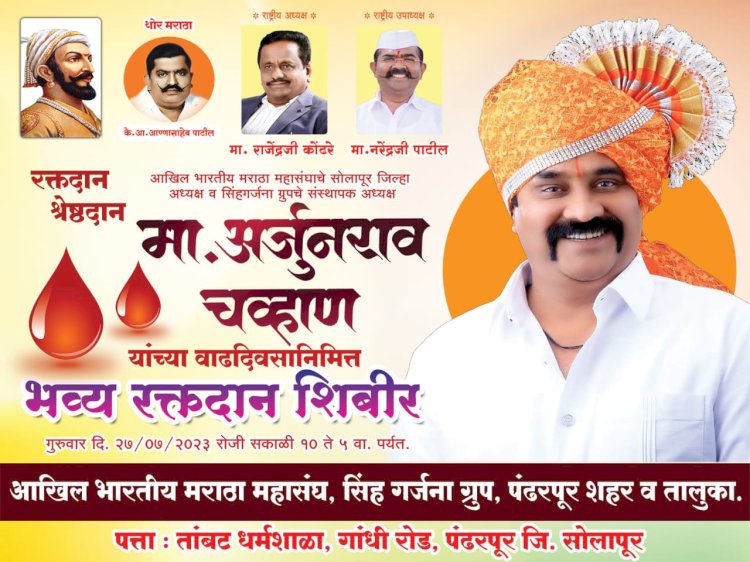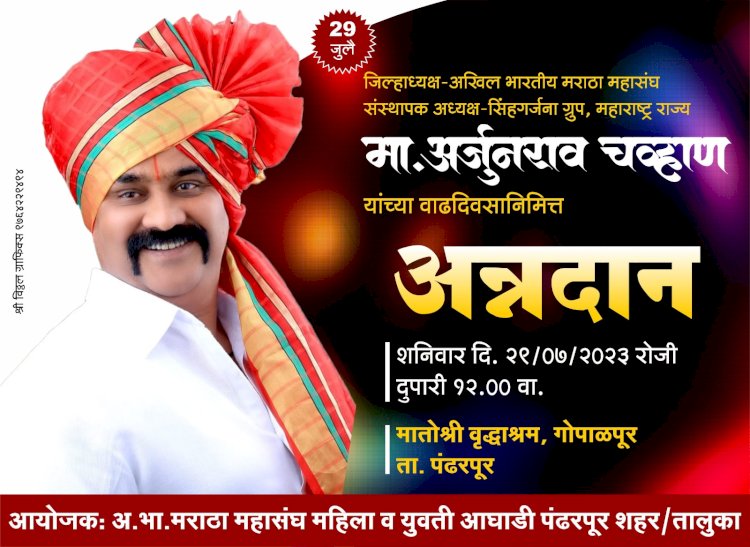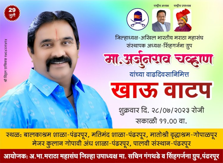 पंढरपूर (प्रतिनिधी) - अखिल भारतीय मराठा महासंघाचे जिल्हाध्यक्ष सिंहगर्जना ग्रुप पंढरपूरचे संस्थापक अध्यक्ष अर्जुनराव चव्हाण यांच्या वाढदिवसानिमित्त विविध कार्यक्रम आयोजन करण्यात आले आहे.