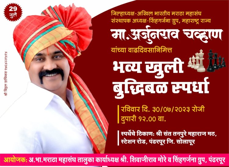 शनिवार दि.२९ जुलै २०२३ रोजी सायं.५ वा.अखिल भारतीय मराठा महासंघाच्या शाखांचे उद्घाटन.प्रमुख पाहुणे अ. भा. मराठा महासंघ मंगळवेढा शहर व तालुका ठिकाण शिवप्रेमी चौक-मंगळवेढा, बस स्थानक-मंगळवेढा, बोराळे नाका-मंगळवेढा नागणेवाडी ता. मंगळवेढा, शिरनांदगी ता. मंगळवेढा येथे होणार असून रविवार दि. ३० जुलै २०२३ रोजी सकाळी १०.वा.जिल्हास्तरीय बुद्धीबळ स्पर्धेचे आयोजन करण्यात आले असून या कार्यक्रमासाठी प्रमुख पाहुणे म्हणून मा.आमदार प्रशांतराव परिचारक,आ. समाधान आवताडे,धनराज शिंदे,राजेंद्र शेळके, डॉ. संजय देशमुख यांच्या उपस्थितीत तांबट धर्मशाळा, गांधी रोड, पंढरपूर येथे होणार आहे.