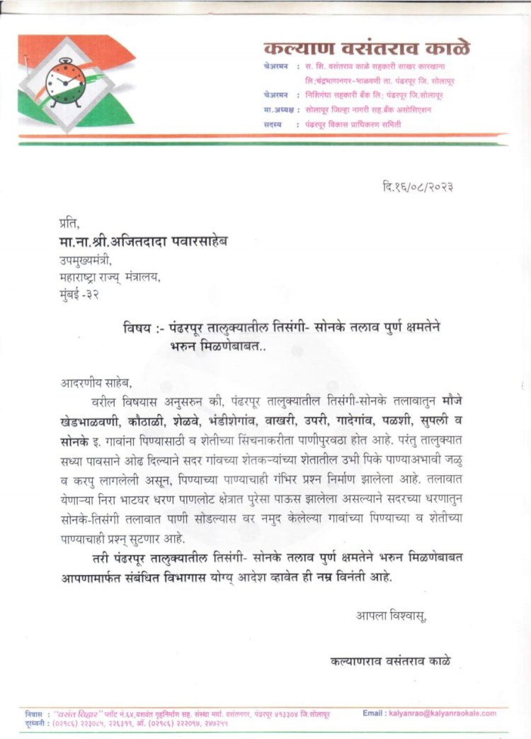 पंढरपूर (दि.17) - पंढरपूर तालुक्याच्या पश्चिम भागातील गावांना शेतीसाठी व पिण्याच्या पाण्याकरीता पुरवठा करणारा तिसंगी-सोनके तलाव पुर्ण क्षमतेने भरुन मिळावा अशी लेखी मागणी मुंबई येथे समक्षभेट घेवून राज्याचे उपमुख्यमंत्री अजितदादा पवार यांचेकडे राष्ट्रवादी काँग्रेसचे नेते तथा सहकार शिरोमणी वसंतराव काळे सहकारी साखर कारखान्याचे चेअरमन कल्याणराव काळे यांनी केली आहे.