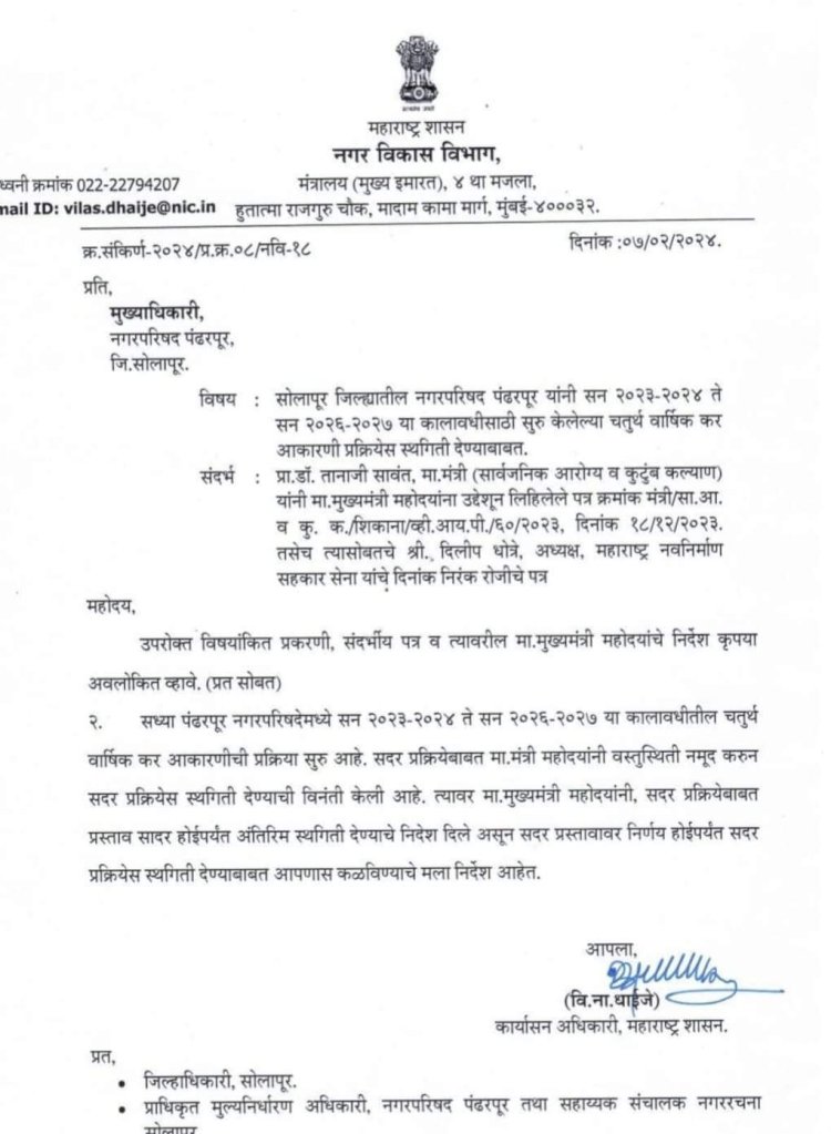 याबाबत विविध पक्ष संघटना यांनी मोर्चे आंदोलने केली, तर मनसेने पंढरपुर नगर पालिकेवर प्रचंड मोठा मोर्चा काढण्याबरोबरच थेट मनसे नेते दिलीप धोत्रे यांनी सरकारकडे धाव घेतली. याबाबत शासन स्तरावर राज्याचे आरोग्य मंत्री तानाजी सावंत यांच्या माध्यमातून थेट मुख्यमंत्री एकनाथ शिंदे यांच्याकडे दाद मागितली होती.त्यावेळी मनसे नेते दिलीप धोत्रे यांच्या पत्रावर दिनांक १८ डिसेंबर 2023रोजी अंतरिम स्थगितीचा आदेश नगर पालिकेने काढला होता. यानंतर अखेर दिनांक ७ फेब्रुवारी रोजी नगर विकास विभागाने पंढरपूर नगर पालिकेस पत्र देत सदर करवाढ करण्यावर स्थगिती आदेश काढण्यात आला.
