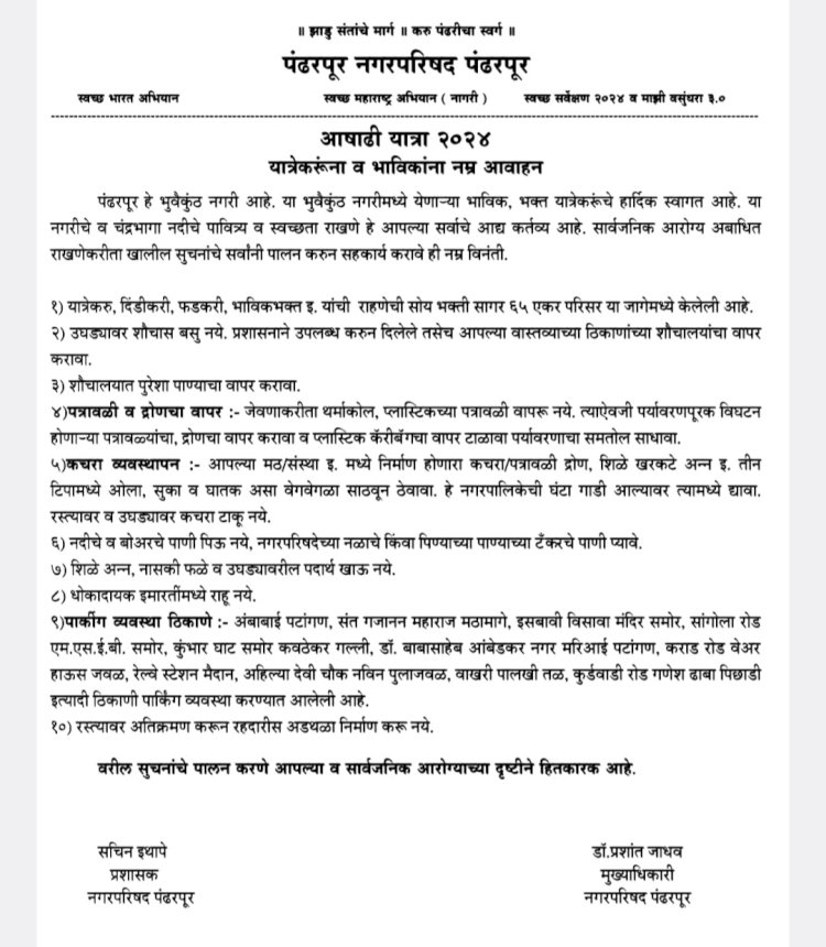 वारकरी बांधवांनी आपले पंढरपूर शहर स्वच्छ राहण्यासाठी सहकार्य करावे व आपल्या आरोग्याची काळजी घ्यावी. असे आवाहन पंढरपूर नगरपालिकेच्या वतीने करण्यात आले आहे.