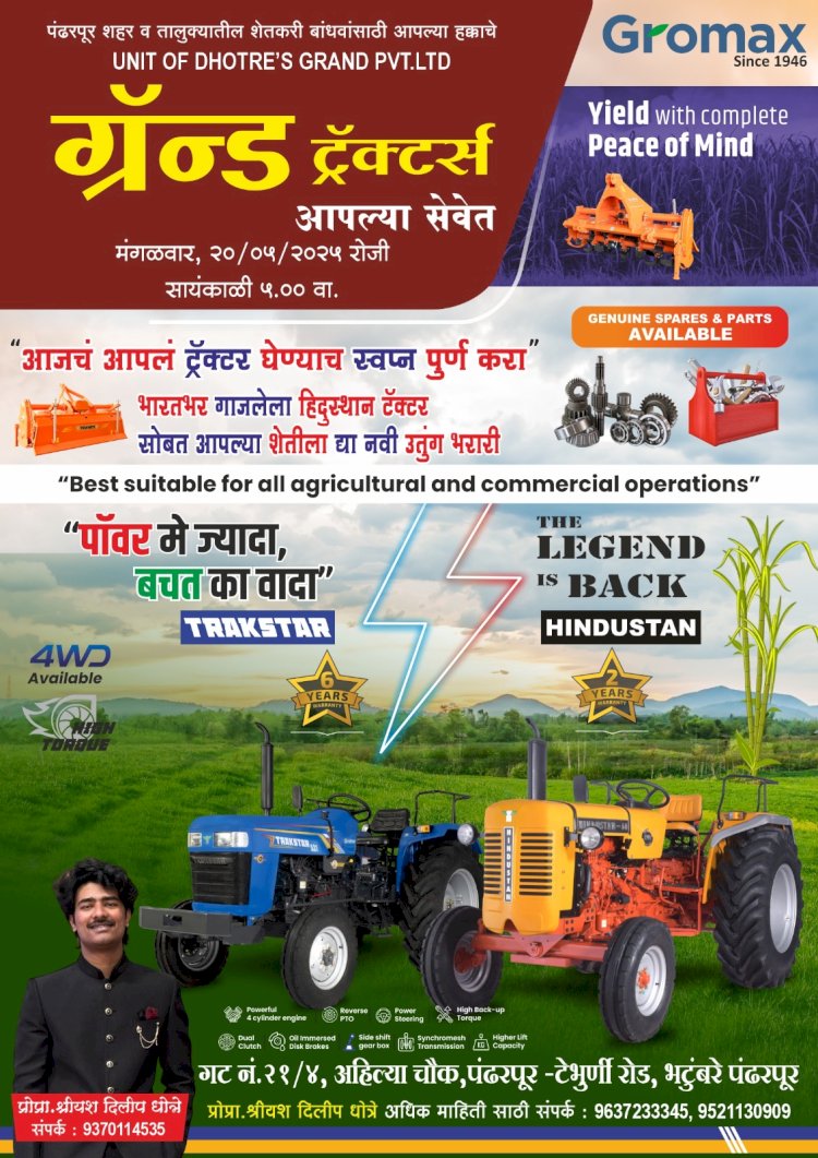 यावेळी मनसे तालुकाध्यक्ष शशिकांत पाटील, अनिल बागल, गणेश पिंपळनेरकर यांच्यासह मनसेचे पदाधिकारी उपस्थित होते.ते पुढे बोलताना म्हणाले की पंढरपूर शहर व तालुक्यातील शेतकरी बांधवांसाठी आपल्या हक्काचे असलेले ग्रँड ट्रॅक्टर्स शोरूम मंगळवारपासून शेतकऱ्यांच्या सेवेसाठी रुजू होणार आहे.