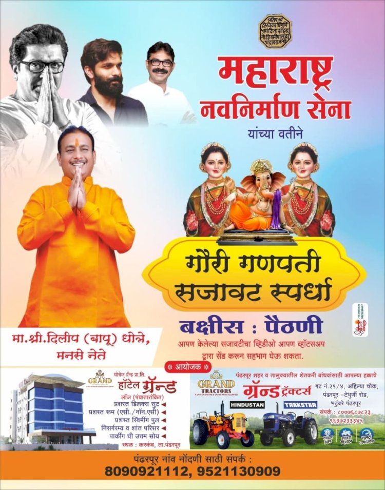 पंढरपूर - गौरी-गणपती सणाच्या निमित्ताने महाराष्ट्र नवनिर्माण सेनेच्या वतीने मनसे नेते दिलीप बापू धोत्रे यांच्या संकल्पनेतून पंढरपूर येथे गौरी गणपती सजावट स्पर्धेचे आयोजन करण्यात आले असून, या स्पर्धेत सहभागी होण्याचे आवाहन मनसेच्या वतीने करण्यात आले आहे.स्पर्धेतील विजेत्यांना आकर्षक बक्षीस भेट देण्यात येणार आहे.
