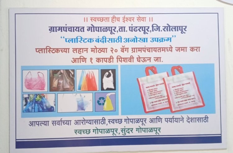 प्लास्टिक वापर टाळा, कापडी बॅग चा पर्याय निवडा असे आवाहन डाॅ. मल्सिनाथ कलशेट्टी यांनी ग्रामस्थांना केले आहे. गोपाळपूर ग्रामपंचायतीने मुख्यमंत्री समृध्द पंचायतराज अभियान अंतर्गत ही उपक्रम राबविला आहे. तौ कौतुकास्पद आहे. एखाद्या पॅचायत अधिकारी यांनी मनावर घेतले तर काय होऊ शकते या ग्रामपंचायती मध्ये राबविलेल्या विविघ उपक्रमा वरून दिसून येत असल्याचे डाॅ. मल्लिनाथ कलशेट्टी यांनी सांगितले. या कार्यक्रमात त्यांनी प्लास्टिक मुक्तीची शपथ सर्वाना दिली.